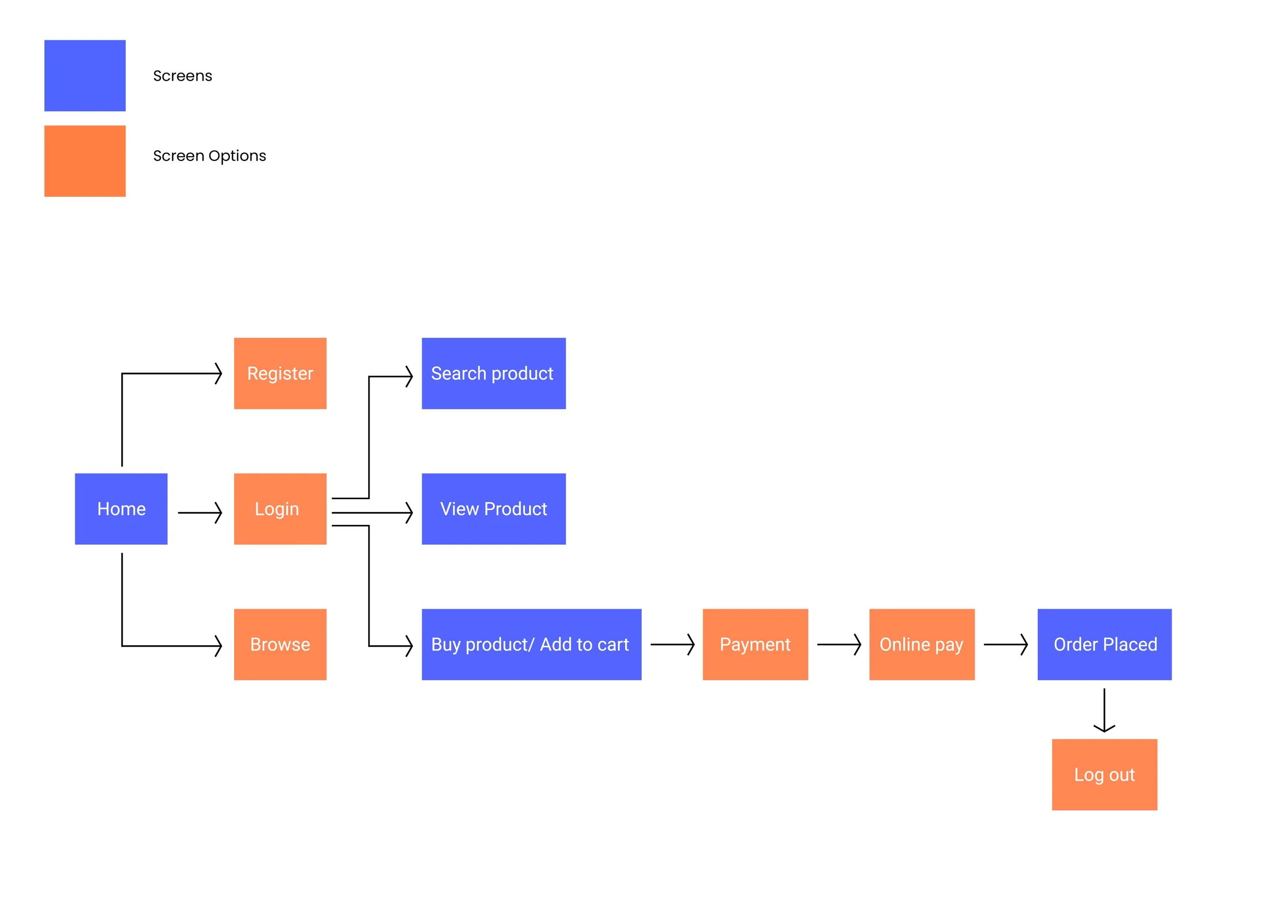 I then started mapping out the screens and behaviours (options) of the user’s journey through my mobile shopping app.