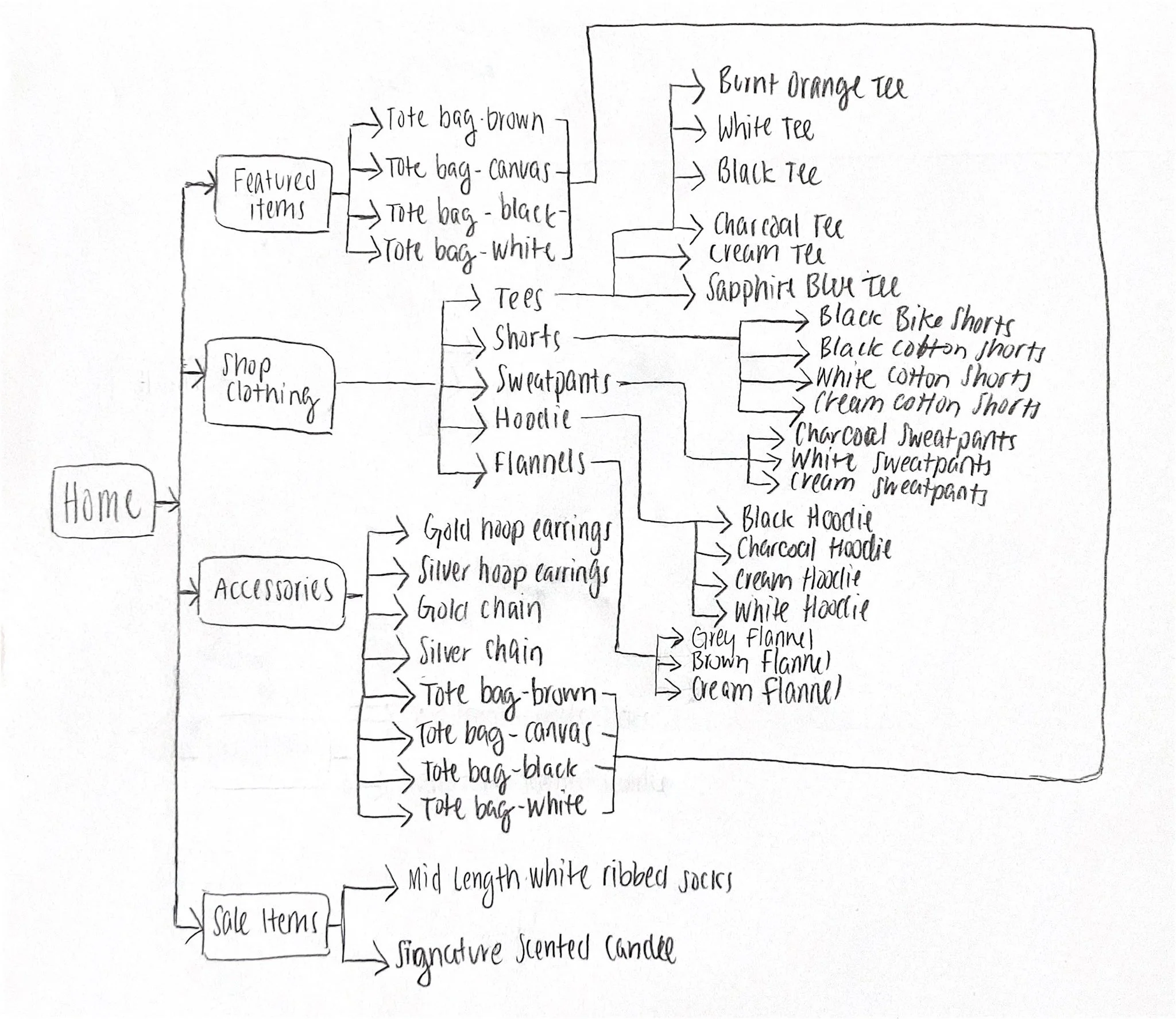 Before anything else, I gathered up all of the items that were needed for the shopping app, and used the tree testing method to organize the product. I started out on paper, and moved to a spreadsheet to organize each category with individual tabs. From there, I was able to identify which items belonged in which category, and did simple user testing using specific questions to understand the user journey through the app.